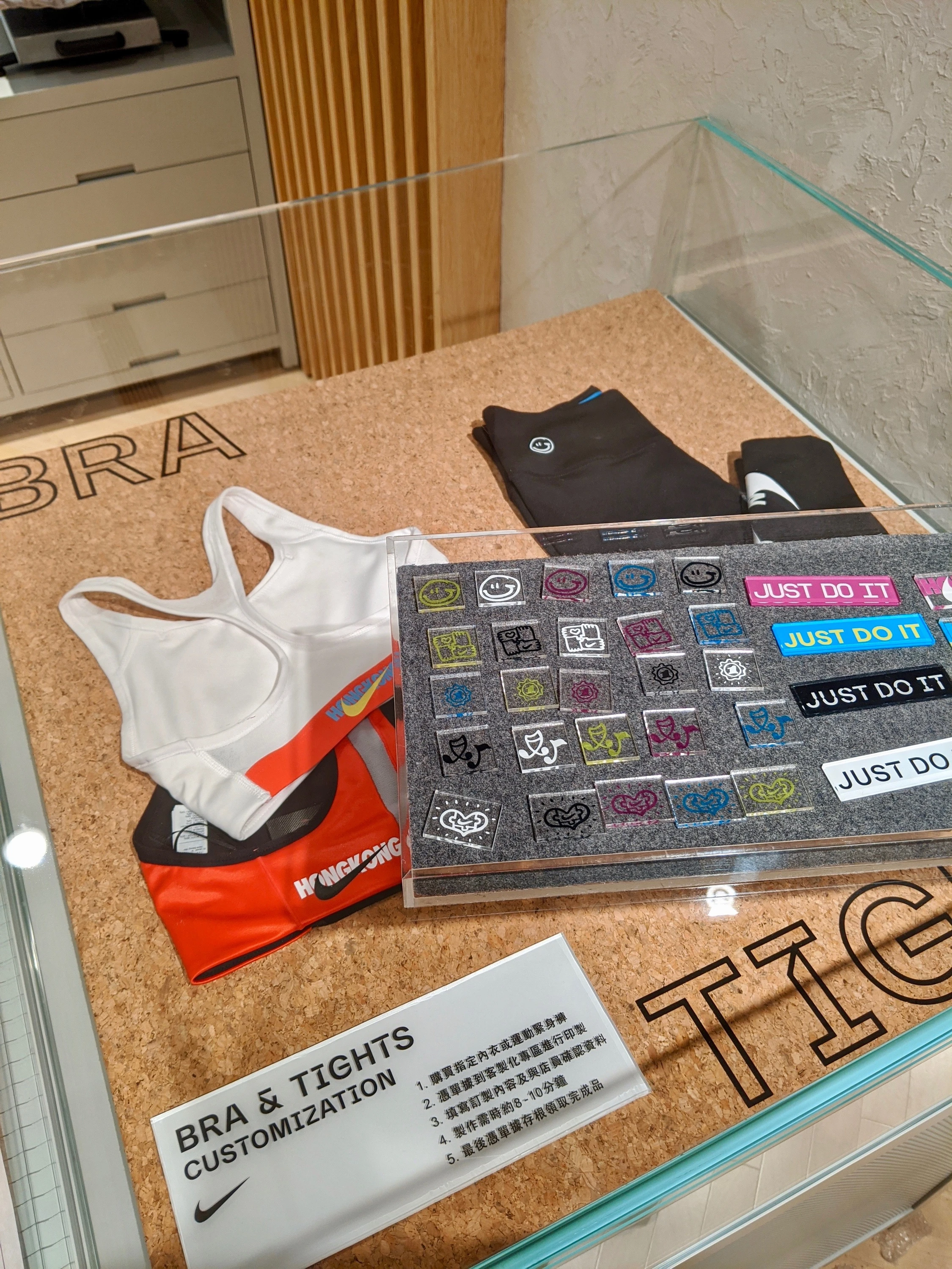 試身室地板和牆身也同樣採用了 Nike Grind 回收物料打造,女士試身室的鏡子可調校角度,同時設備按鍵呼叫店員;另一賣點是女性服飾熱轉移染服務,顧客可以自選圖案印在指定運動內衣和緊身褲上。
