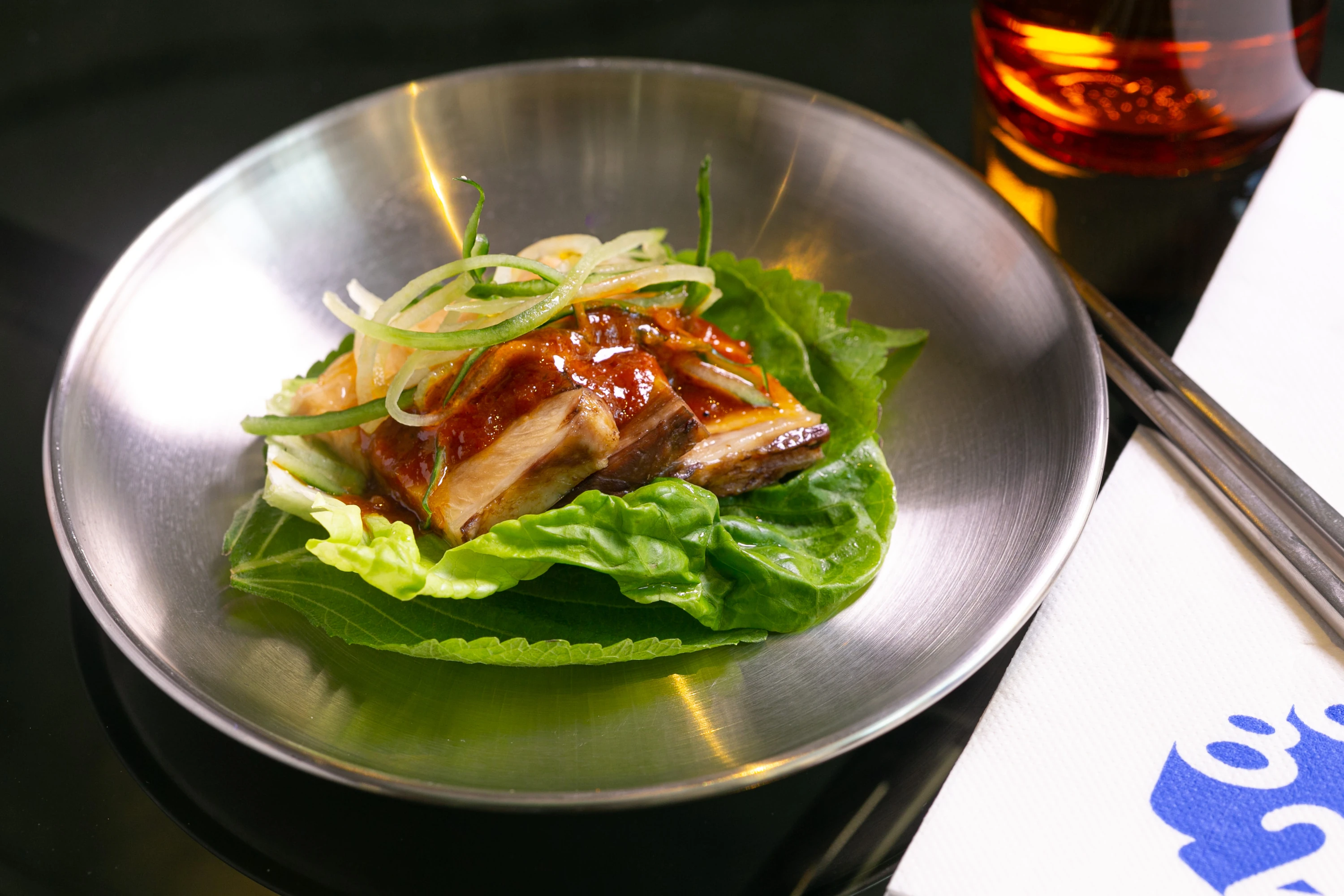 食物主打新派意韓菜式。主廚 Marco Livoti 來頭不少,曾於倫敦二星米芝蓮餐廳擔任副主廚,擅於運用食材配搭,創出不一樣的意韓菜式。推介 Ssam Bouquet 慢煮豬腩生菜卷($58)豬腩肉經過八小時慢煮烹調,肉質軟腍 Juicy ,配以韓國芝麻葉、生菜及韓國辣醬,入口帶有淡淡獨特清新果香。