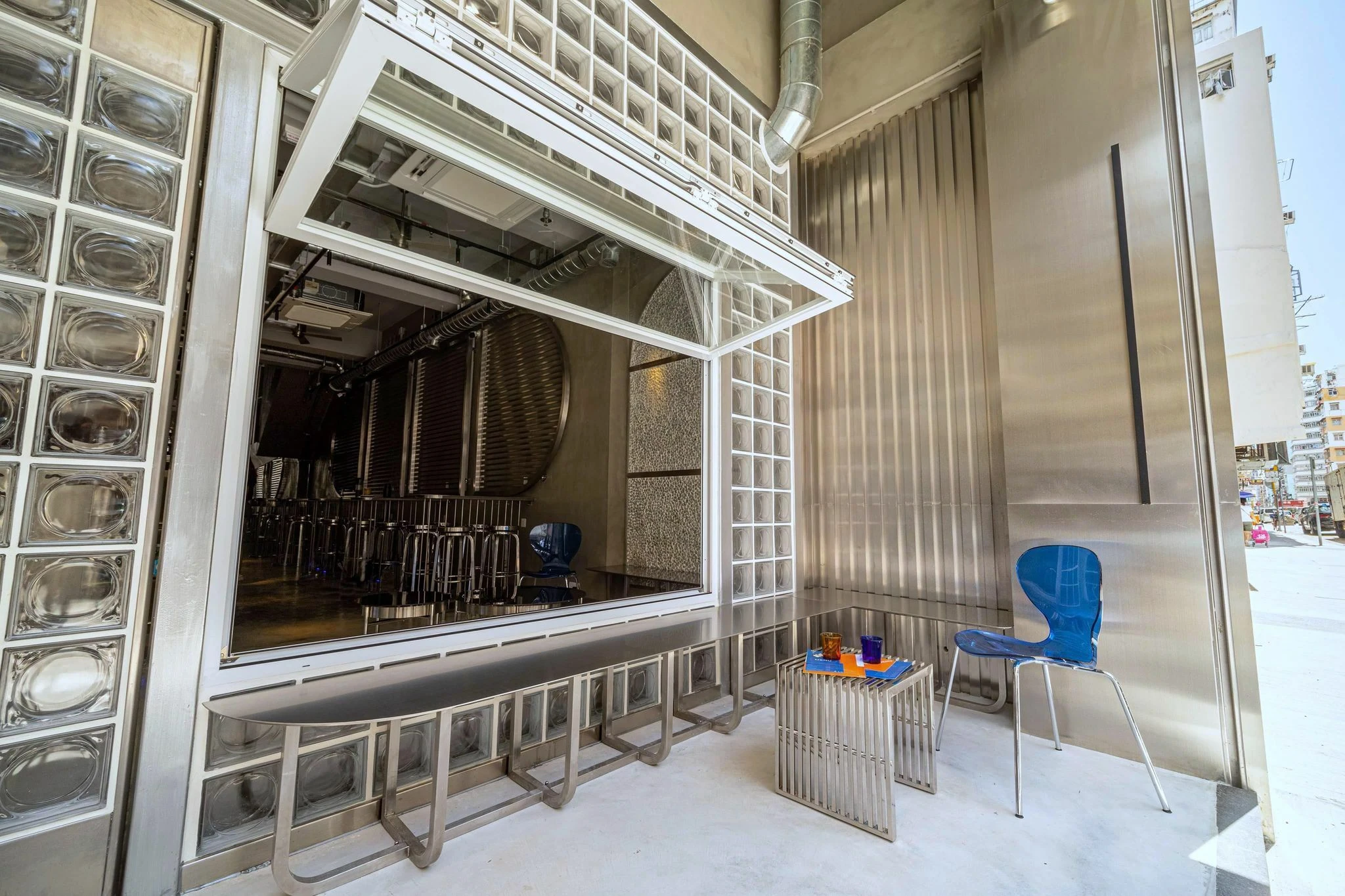 全店以時尚型格銀灰為主軸,開放式的廚房酒吧主導室內空間,高枱延續拱形設計,配以螢光藍色及幻變燈飾、混凝土地板、玻璃磚和裸露的風管,沒有多餘的修飾,充滿未來感,打卡位處處。