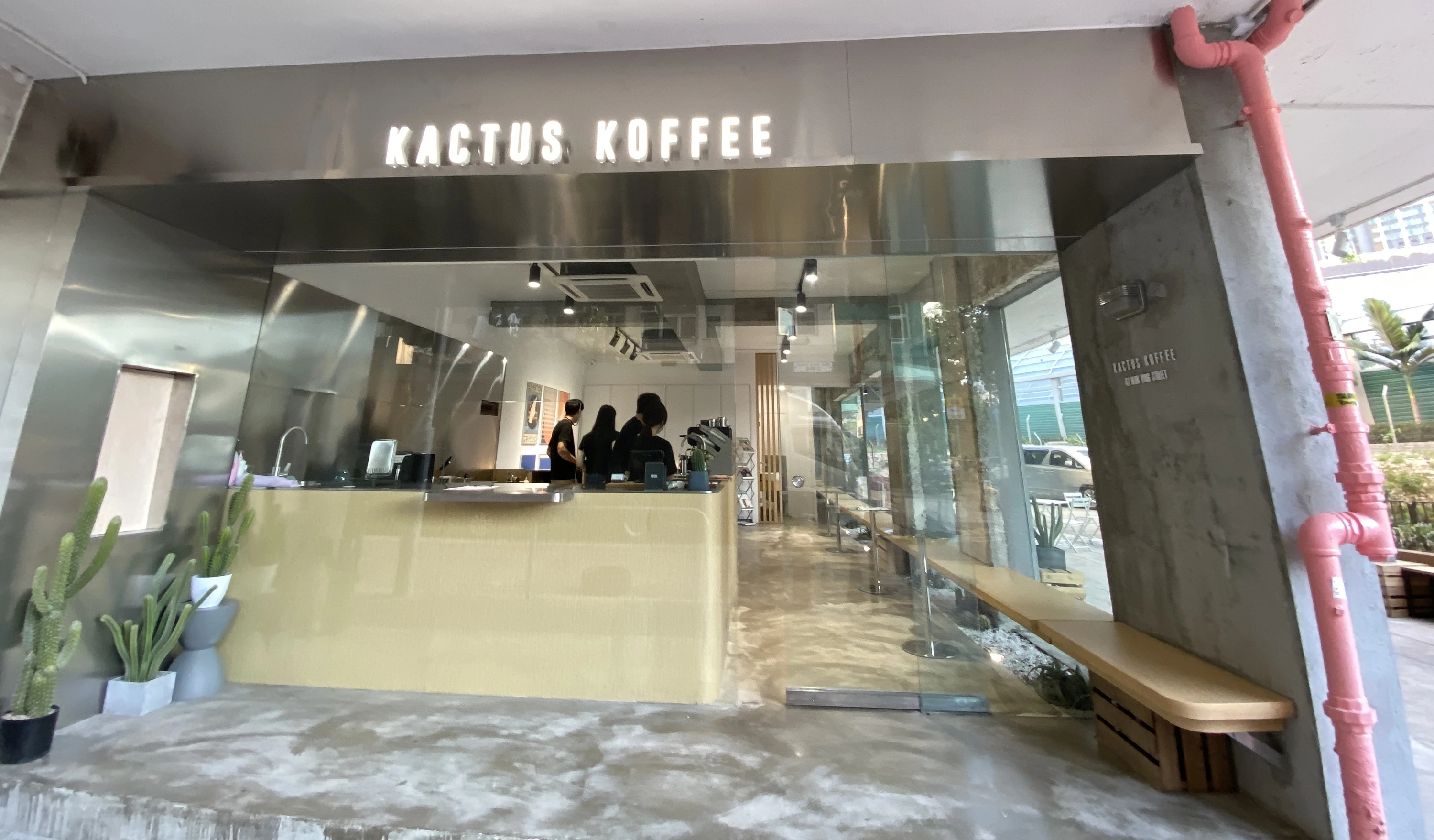 由韓國人開設的咖啡小店 Kactus Koffee 最近由深水埗搬到渡船角文英街尾,左鄰右里都是車房老舖,粗獷的水泥外牆配襯落地玻璃,門外擺放了仙人掌裝飾,也有木櫈、粉紅摺枱等,跟旁邊疊起的舊輪胎相映成趣,也為這老區添上新色彩。