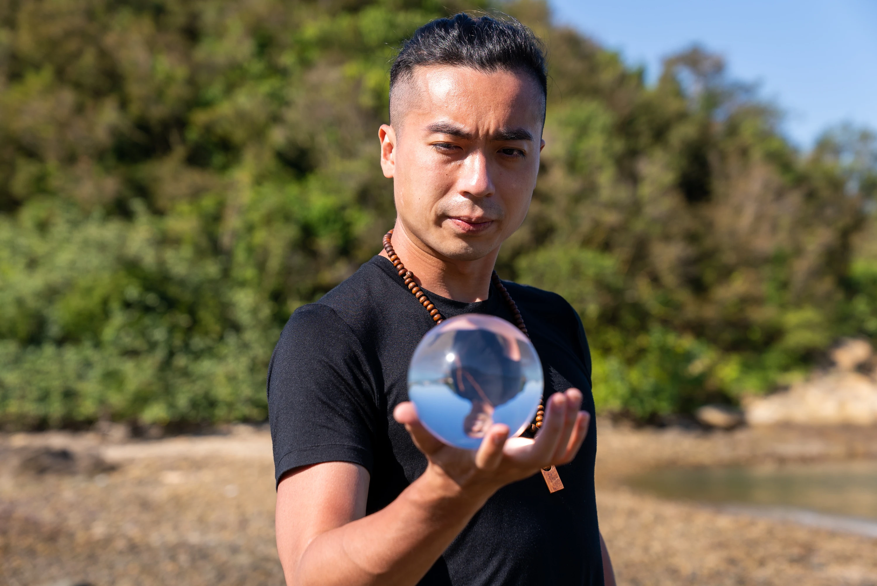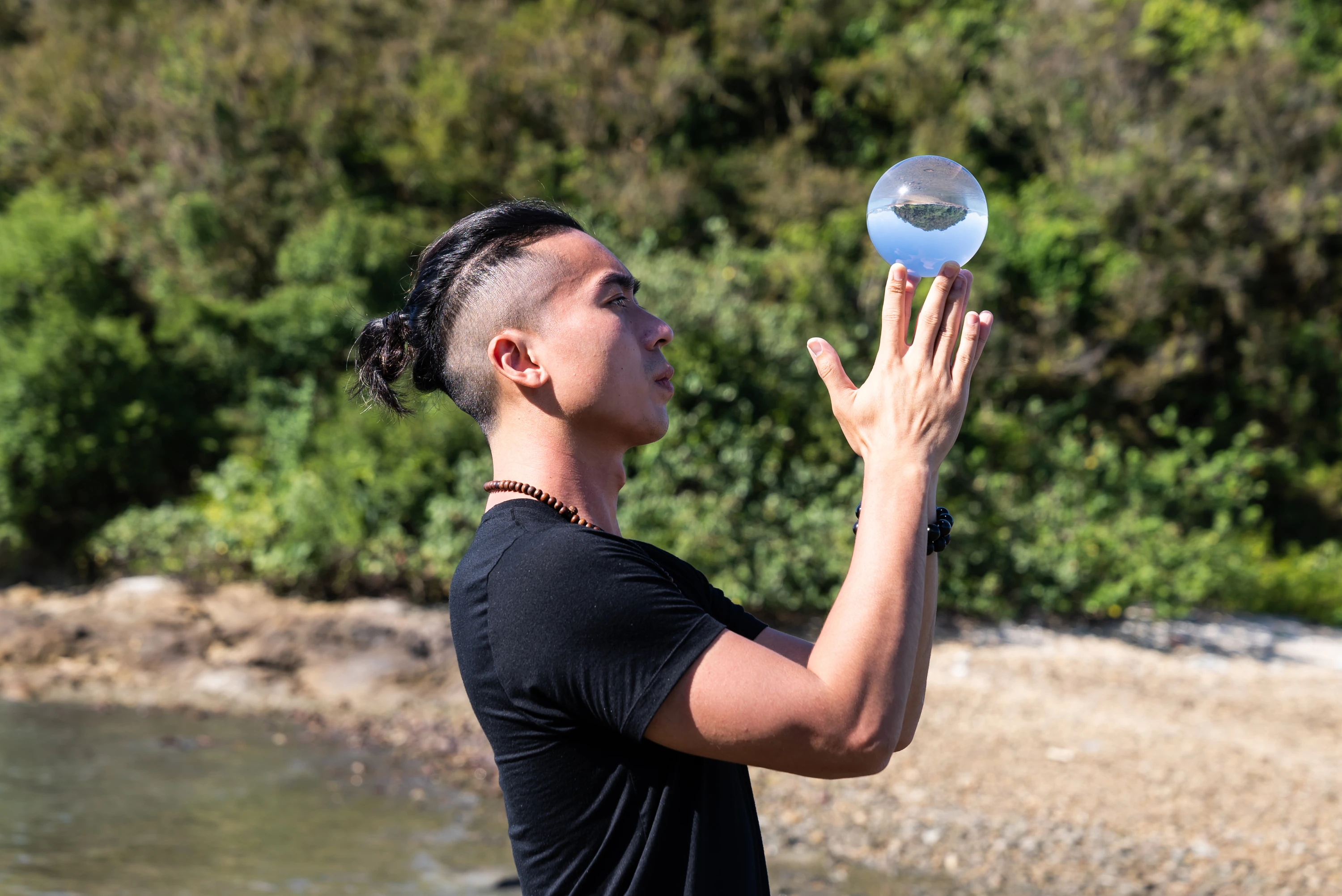 水晶球如今已成為 Navy 生活一部分,他每次外出,袋裏都總會放着一個水晶球。他喜歡到海邊或山澗,手掌抵着球打圈,讓球由手心滑過指縫,溜上肩膊至胸膛,再回到手上。手帶動水晶球,球滑過肌膚又會牽引 Navy 四肢的舞動,讓他的身體臣服於它的流動。在球的世界裏,陸地在上,天空在下,完全顛倒我們對大自然的印象,也讓 Navy 以全新角度欣賞大自然,「我會俾入面嘅世界吸引住,有時倒轉欣賞一件事物,比原本嘅狀態更美。」